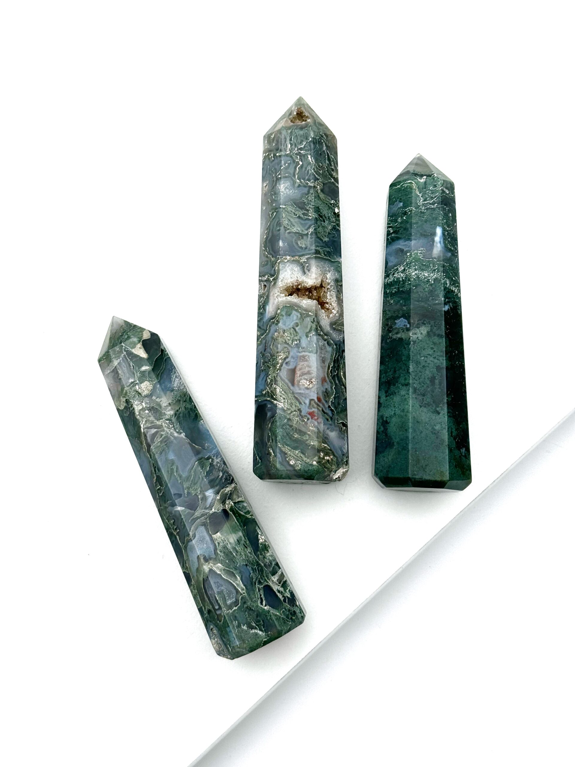 Mos Agaten giver jordforbindelse og knytter dig tættere til naturen og til de energier, der kommer fra jord og planter. Det er en fantastisk krystal at have med sig, når man sår nye frø, både fysisk og i overført forstand. Den styrker nye begyndelser, fjerner blokeringer, og giver vækst i forretninger og personlig udvikling. Den hjælper overtænkende mennesker komme bedre i kontakt med deres følelser og hjælper intuitive mennesker med at se lidt mere praktisk og konkret på energiarbejde.