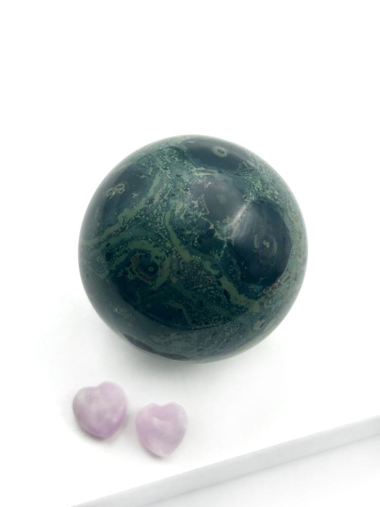 Kambaba Jaspis er en smuk grøn chalcedon med lysegrøn meleret grundfarve og den række karakteristiske mørkere pletter eller plamager, der tit kan have en lysere plet i centrum.