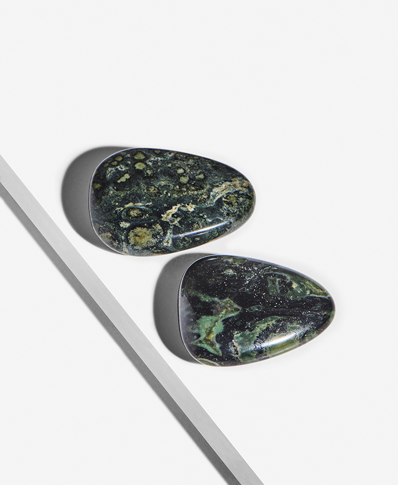 Kambaba Jaspis er en smuk grøn chalcedon med lysegrøn meleret grundfarve og den række karakteristiske mørkere pletter eller plamager, der tit kan have en lysere plet i centrum.