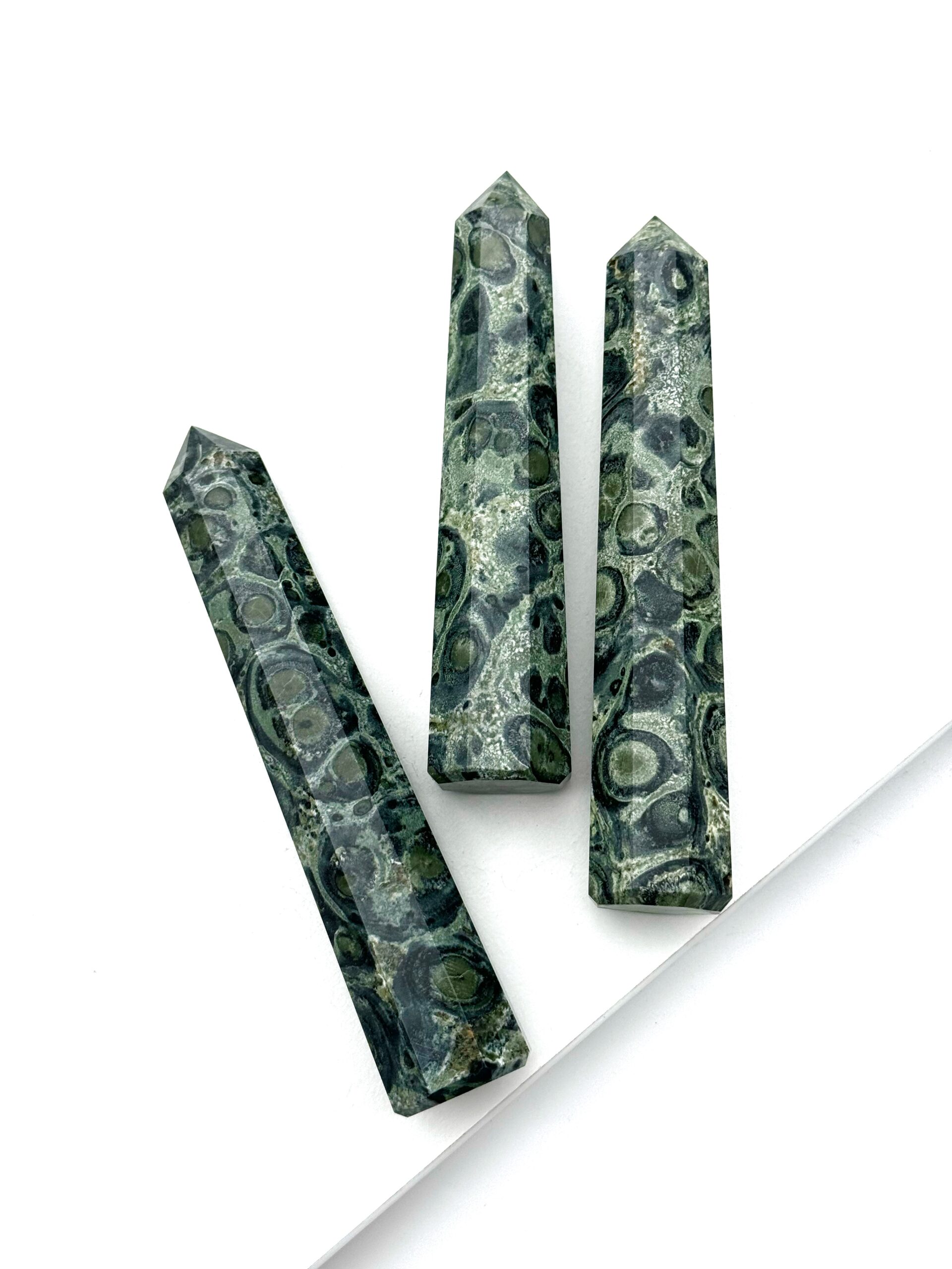 Kambaba Jaspis er en smuk grøn chalcedon med lysegrøn meleret grundfarve og den række karakteristiske mørkere pletter eller plamager, der tit kan have en lysere plet i centrum.