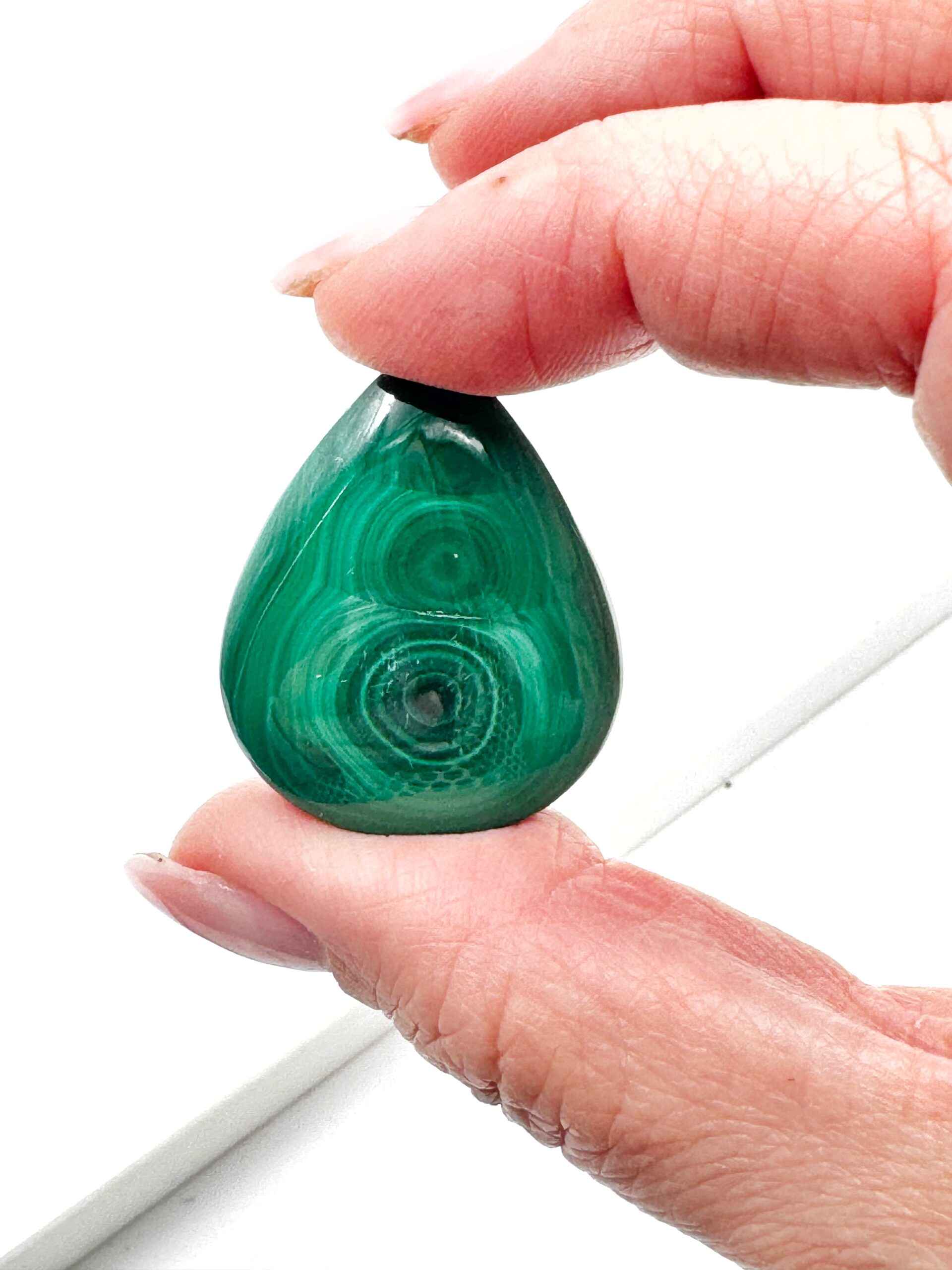 Malakit hjælper på transportsyge og flyskræk. Den er også god mod svimmelhed, hvis du mediterer med stenen på panden.