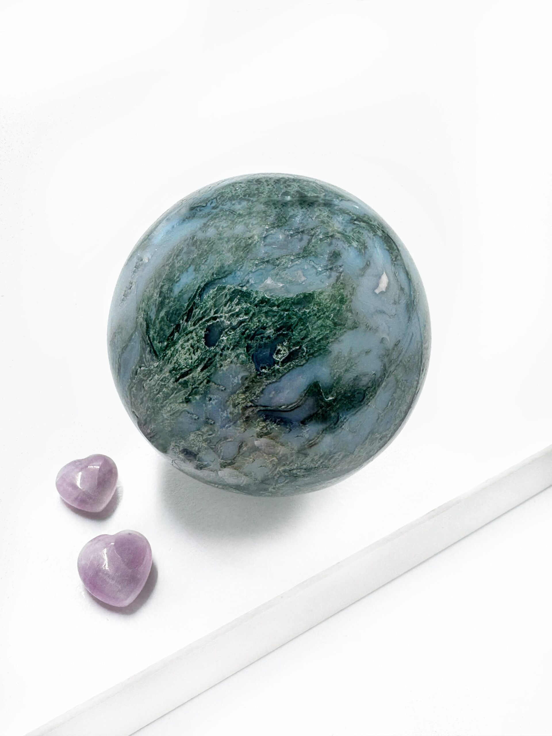 Mos Agaten giver jordforbindelse og knytter dig tættere til naturen og til de energier, der kommer fra jord og planter. Det er en fantastisk krystal at have med sig, når man sår nye frø, både fysisk og i overført forstand. Den styrker nye begyndelser, fjerner blokeringer, og giver vækst i forretninger og personlig udvikling. Den hjælper overtænkende mennesker komme bedre i kontakt med deres følelser og hjælper intuitive mennesker med at se lidt mere praktisk og konkret på energiarbejde.
