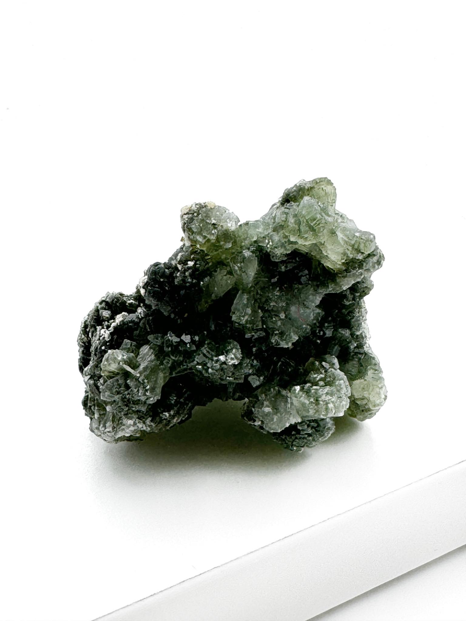 Grøn Prehnit tåler vand og kan med fordel energirenses med saltvand, havvand eller rindende vand.