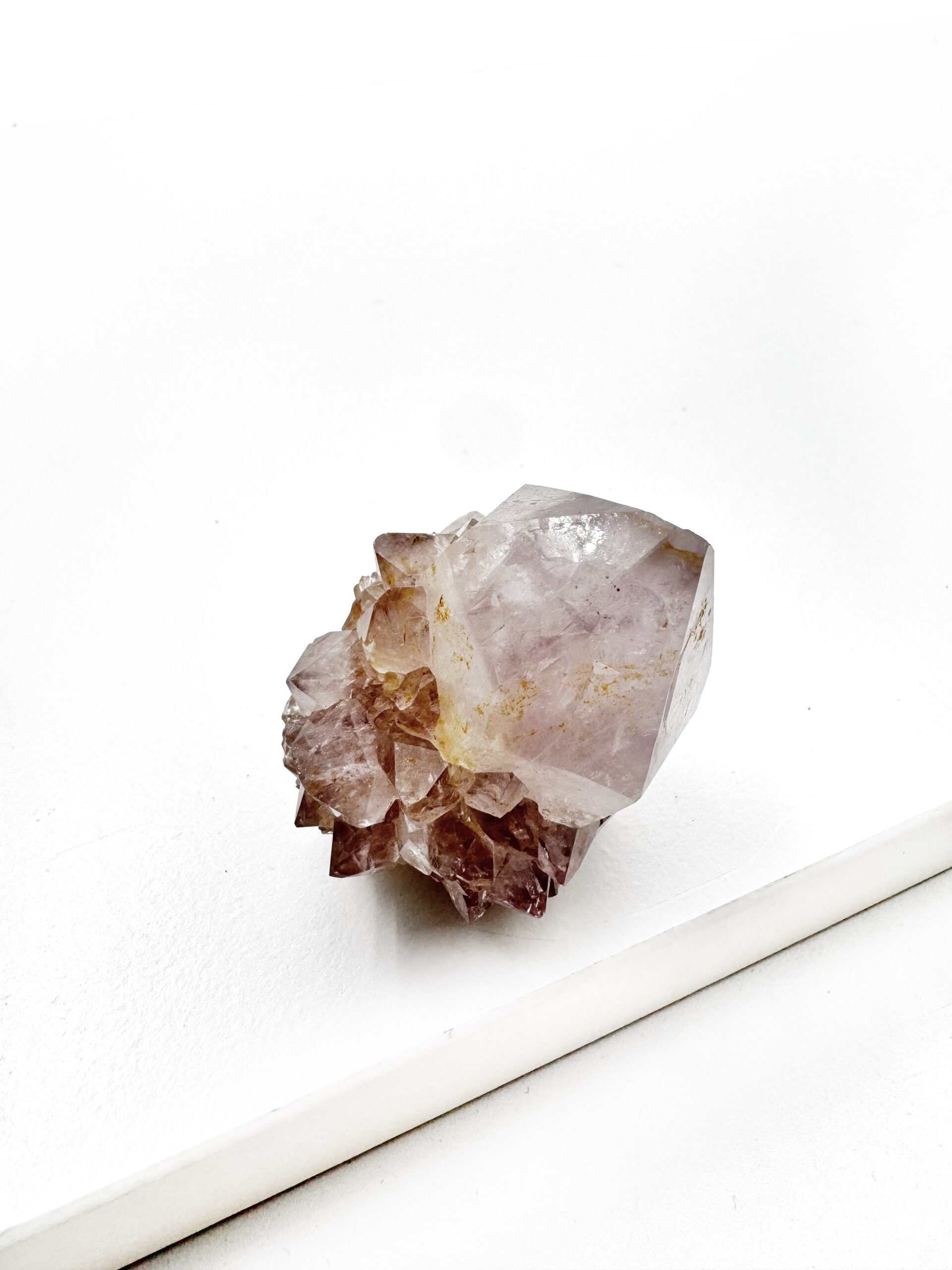 Spirit Ametyst / Kaktus Ametyst / Spirit Kvarts er en unik og spirituelt kraftfuld krystal, kendt for sin klare, violette glød og subtile, næsten lysende energi. Den findes blandt andet i Sydafrika, hvor den ofte dannes i facetterede “cactus”-lignende klynger, omgivet af mindre druser, hvilket gør hver krystal helt unik. Spirit Ametyst betragtes som en af de mest transformative og hjerte-åbnende krystaller i krystalverdenen.