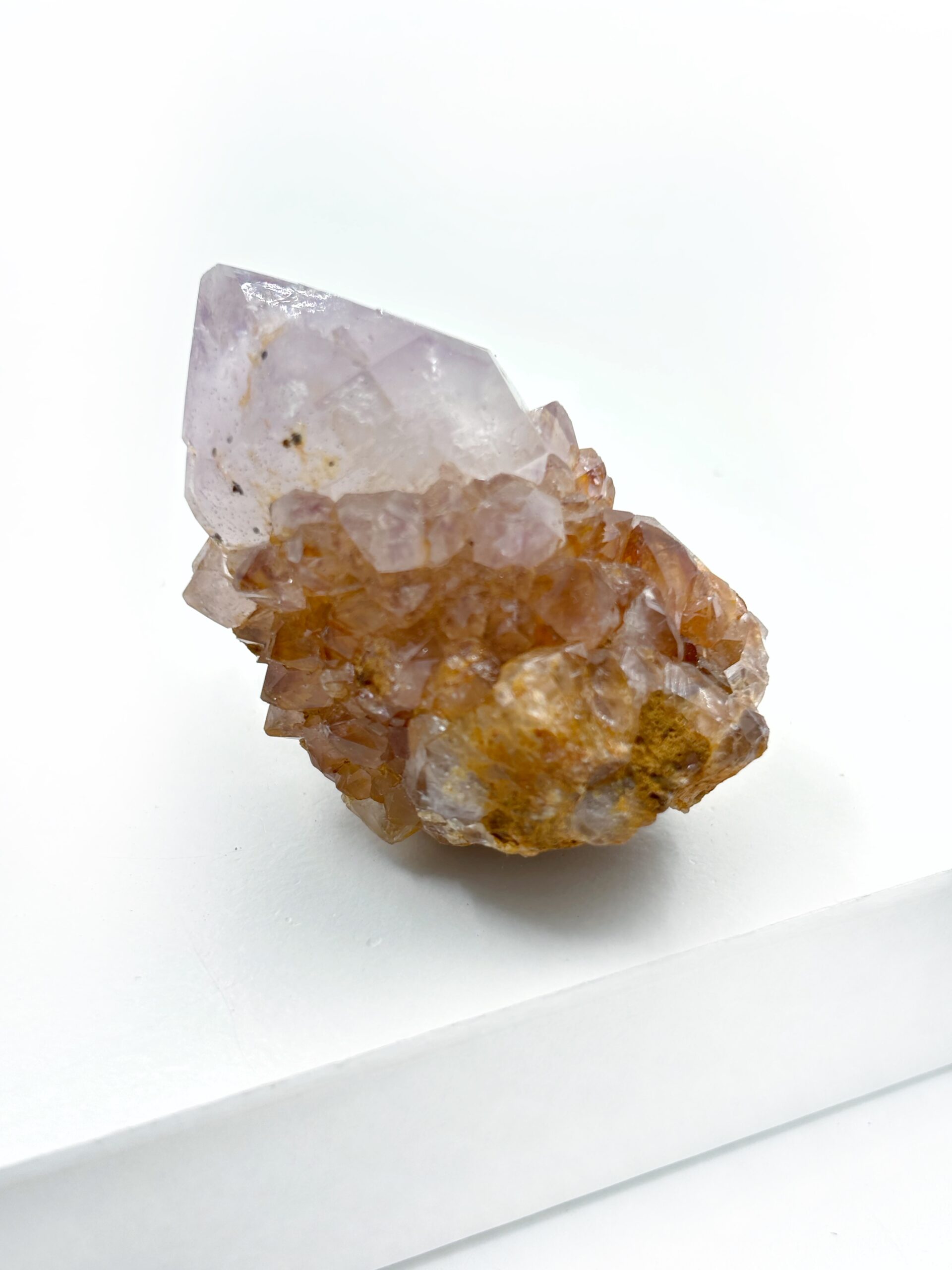 Spirit Ametyst / Kaktus Ametyst / Spirit Kvarts er en unik og spirituelt kraftfuld krystal, kendt for sin klare, violette glød og subtile, næsten lysende energi. Den findes blandt andet i Sydafrika, hvor den ofte dannes i facetterede “cactus”-lignende klynger, omgivet af mindre druser, hvilket gør hver krystal helt unik. Spirit Ametyst betragtes som en af de mest transformative og hjerte-åbnende krystaller i krystalverdenen.