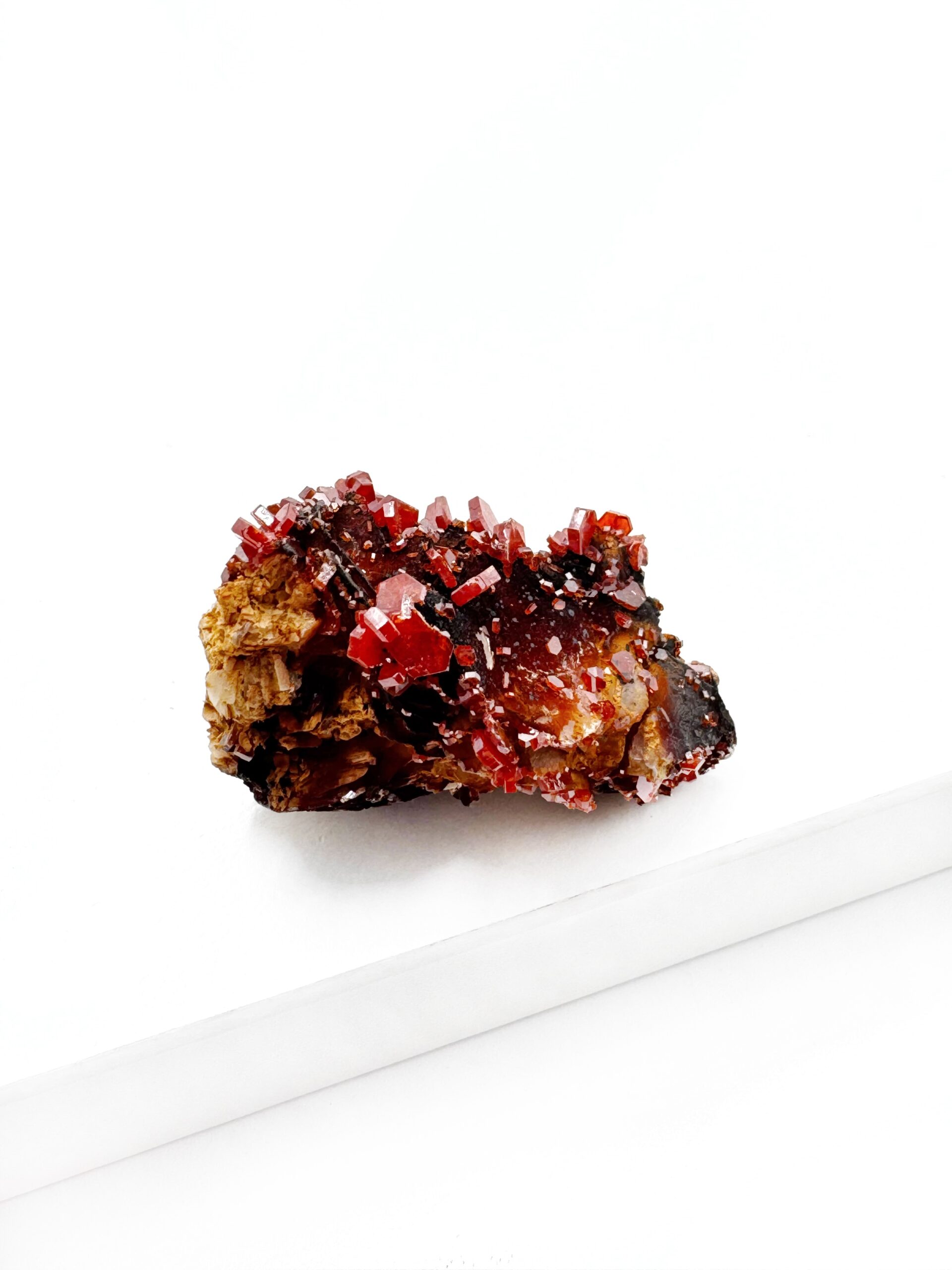 Vanadinit er en krystal, der fremmer mental klarhed, handling og produktivitet. Den er ideel til lange arbejdstimer, studier eller træning, da den aktiverer de nederste tre chakraer og giver fokus og beslutsomhed. Samtidig åbner den tredje øje, hvilket hjælper med at skabe klarhed og tålmodighed under udfordrende opgaver.